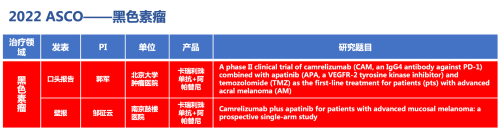 黑色素瘤领域的2篇研究摘要,采用AG亚游医药自主研发的PD-1抑制剂卡瑞利珠单抗(艾瑞卡)联合阿帕替尼(艾坦)(“双艾”组合)的免疫联合抗血管(或再联合化疗)的治疗策略。