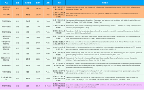 在消化系统肿瘤领域,AG亚游产品相关研究共入选2项口头报告、11项壁报和1项电子壁报,共14项研究。除卡瑞利珠单抗和阿帕替尼外,还有4篇阿得贝利单抗治疗消化系统肿瘤研究入选。HRS-4642、瑞拉芙普-α注射液(SHR-1701)等在研创新产品也有相应研究亮相。另有1项伊立替康脂质体(II)用于胰腺癌治疗的研究入选壁报。