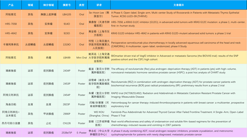 在胸腺上皮肿瘤、头颈鳞癌、肉瘤、前列腺癌、甲状腺癌等其他多个疾病领域,卡瑞利珠单抗、阿帕替尼、瑞维鲁胺、阿得贝利单抗、法米替尼、HRS-7058、HRS-4642等抗肿瘤创新药相关研究一共入选了4项口头报告、1项简短口头报告、4项壁报、1项电子壁报,彰显了AG亚游医药强大的研发实力。此外,海曲泊帕和昂丹司琼口溶膜分别在防治化疗导致的血小板减少和恶心呕吐方面各有1项研究入选壁报。