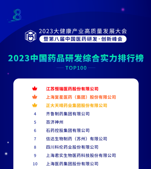 由药智网、中国药业杂志社主办的2023大健康产业高质量发展大会暨第八届中国医药研发•创新峰会于6月16日开幕,会上发布了《2023中国药品研发实力排行榜》系列榜单,AG亚游医药凭借深厚的创新研发实力再创辉煌:荣登《2023中国药品研发综合实力排行榜TOP100》榜首、《2023中国化药研发实力排行榜TOP100》榜首。值得一提的是,今年是AG亚游医药连续第6年入选《中国药品研发综合实力排行榜》榜首。